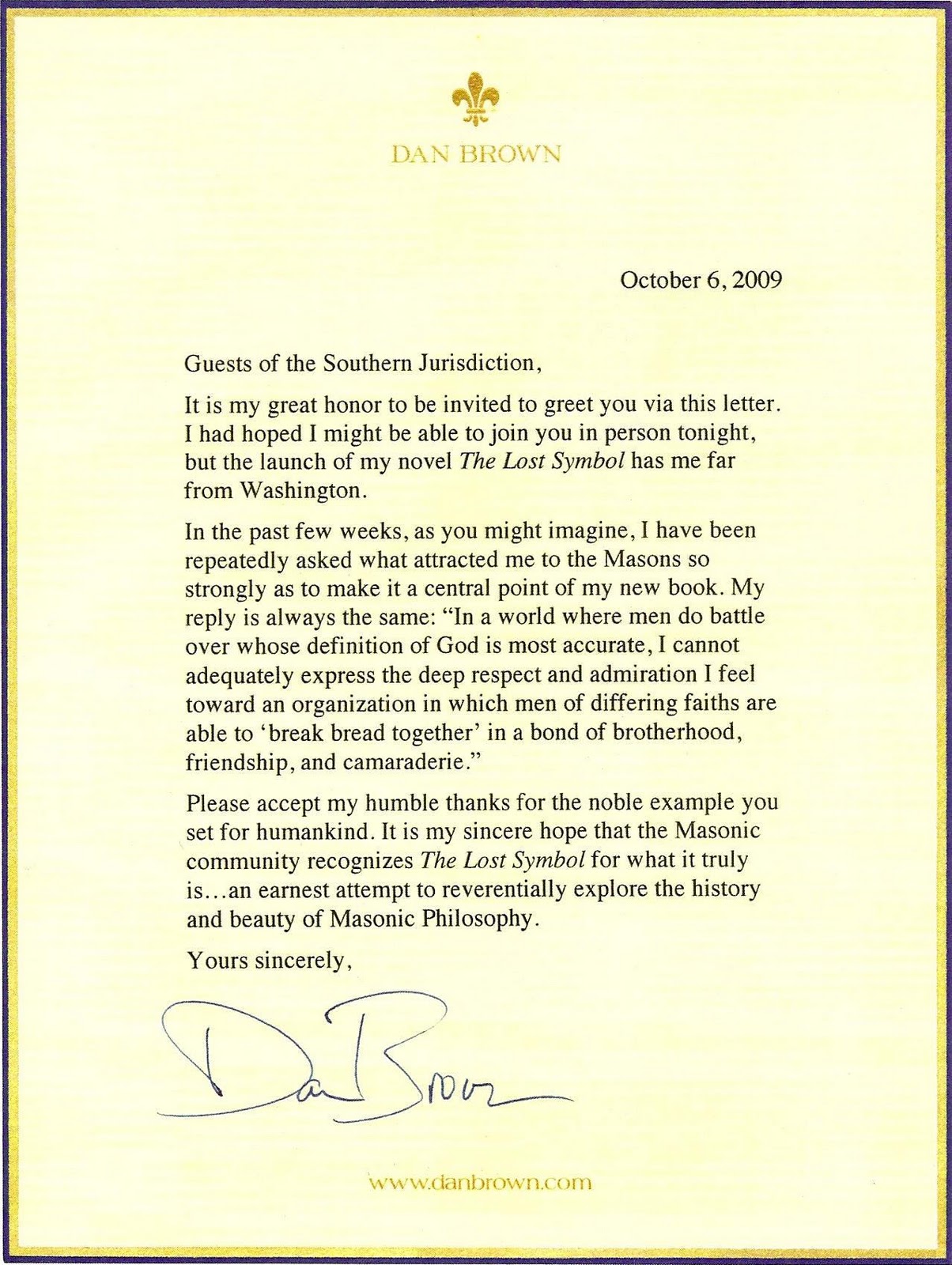Carta enviada pelo escritor Dan Brown ao Supremo Conselho do Rito Escocês Antigo e Aceito da Jurisdição Sul dos EUA, o qual serviu de cenário principal para o climax de seu romance “O Símbolo Perdido”: